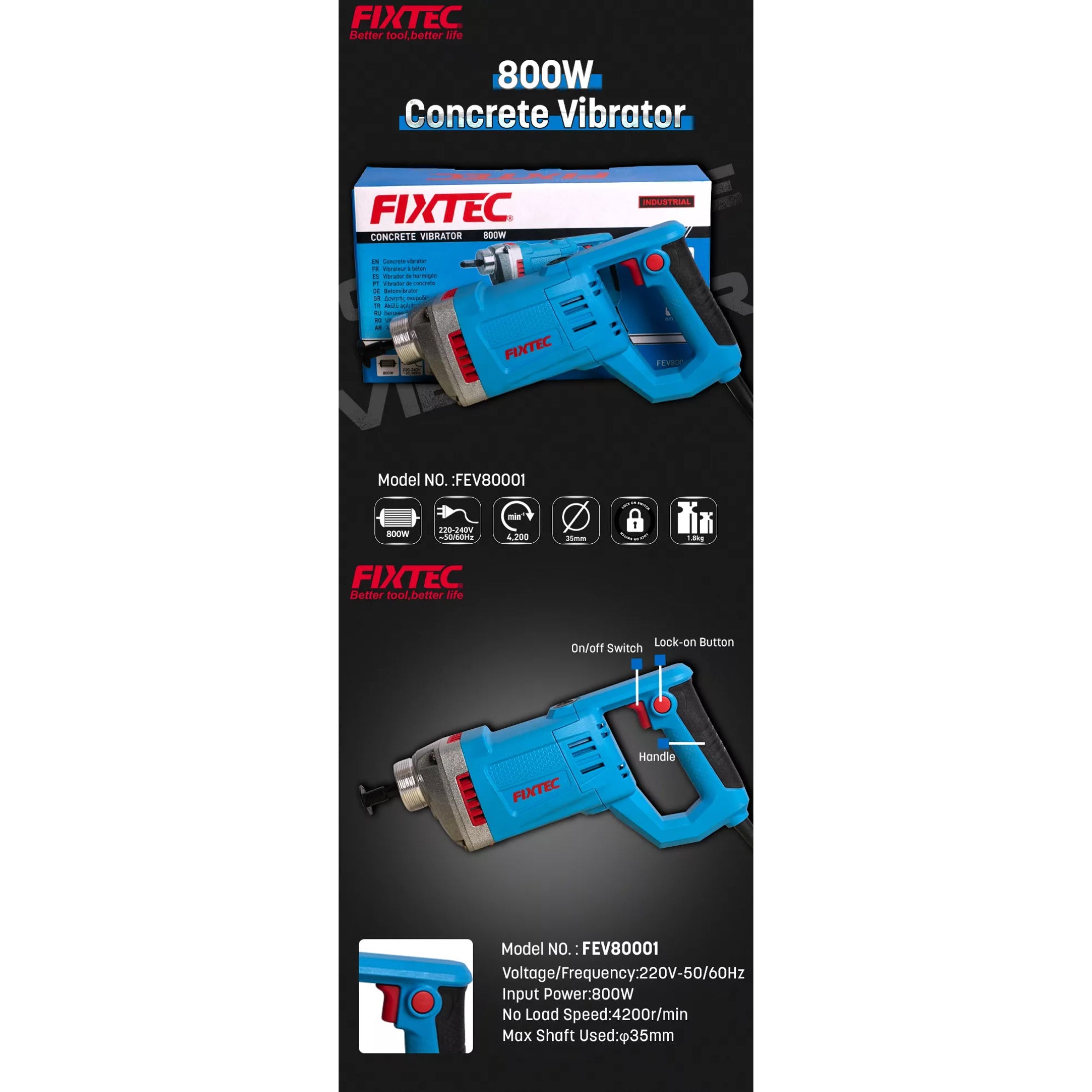 Incluye Sonda Vibradora para hormigon 35mm de 1.5 metros de largo, compatible con Vibrador Fixtec FVS35150